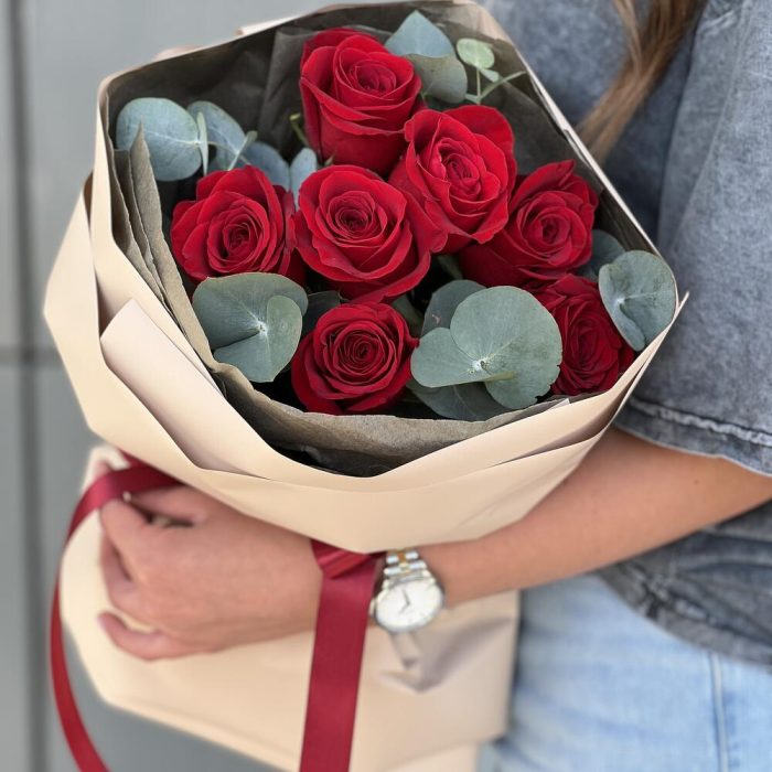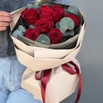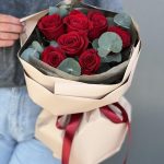 11 красных роз с эвкалиптом