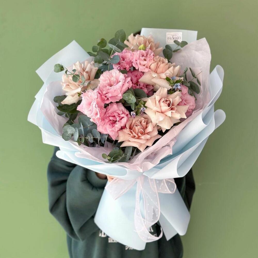 Romano Букет из роз и лизиантуса в оформлении – Выбрав букет от DaVinci Flowers Вы скрасите день обладательницы букета и подарите ей незабываемые эмоции