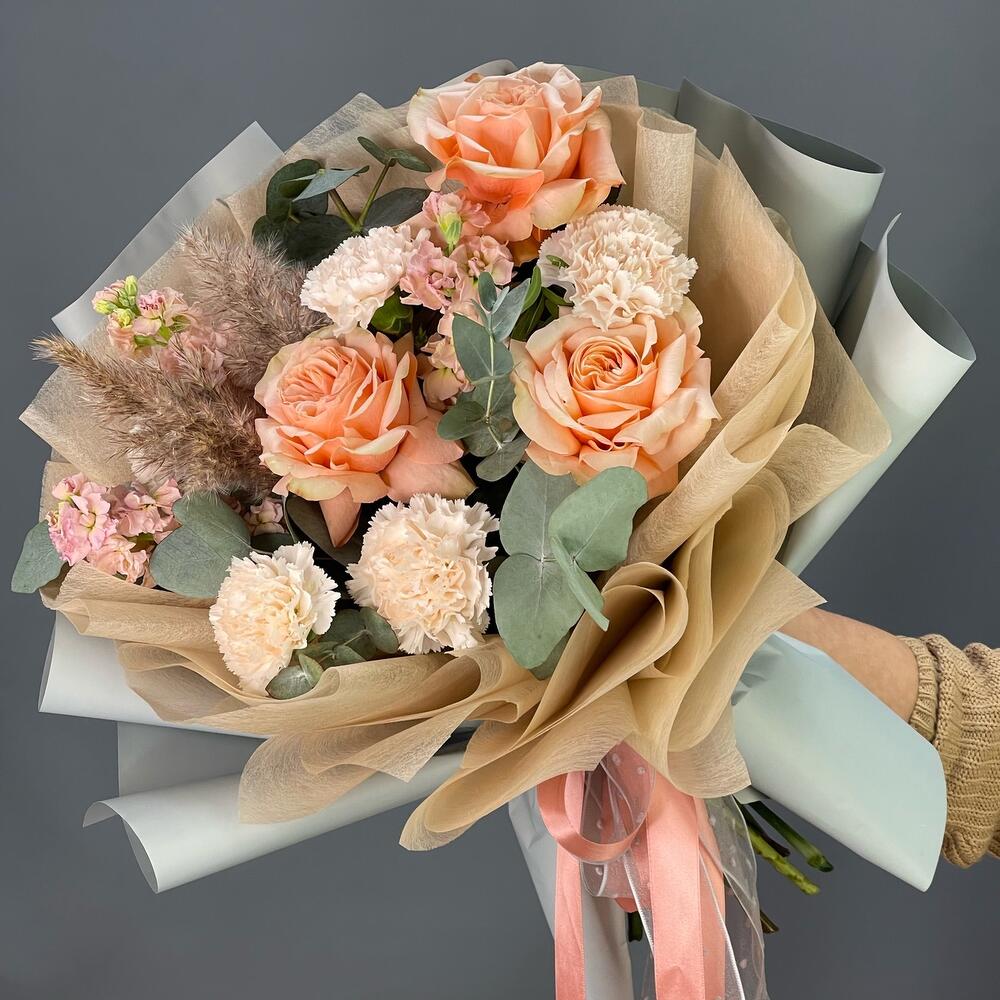 Лента – 2 шт.Маттиола – 3 шт.Эвкалипт – 2 шт.Роза одноголовая – 3 шт.Фисташка – 3 шт.Упаковка дизайнерская – 1 шт.Гвоздика одноголовая – 5 шт.камыш сухоцвет – 2 шт.