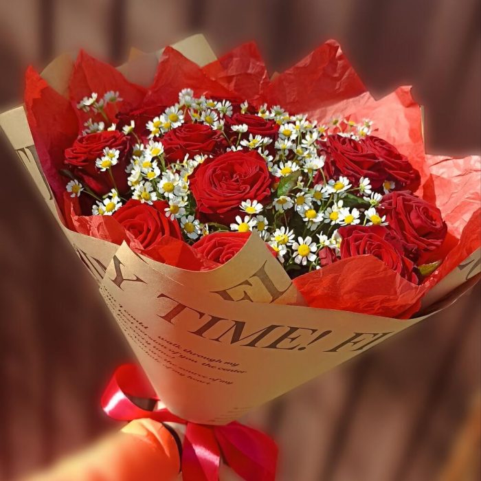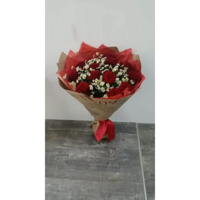 Тишью – 3 шт.Матрикария – 5 шт.Крафт – 5 шт.Роза россия красная 60 см – 13 шт.