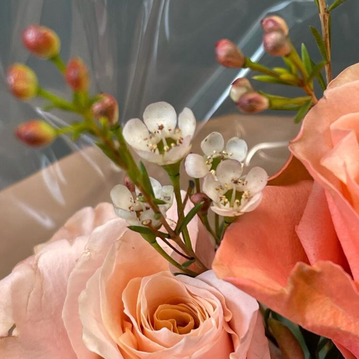 Ваксфлауэр – 2 шт.Лента – 1 шт.Эвкалипт – 2 шт.Роза одноголовая – 11 шт.Упаковка дизайнерская – 1 шт.