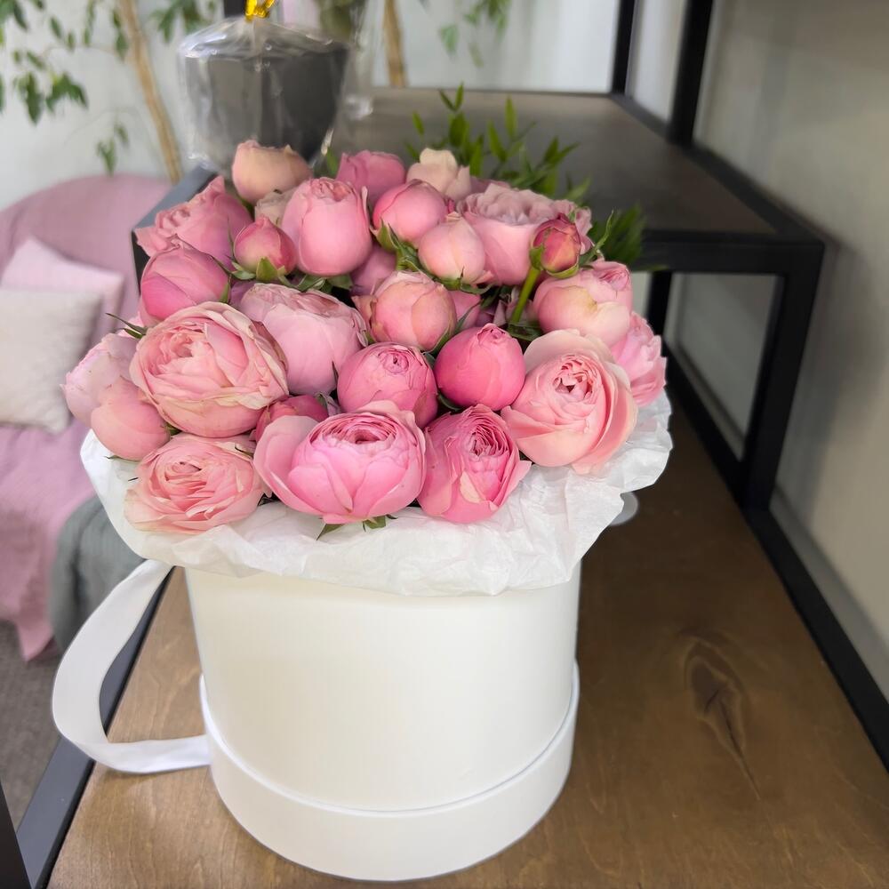 Пионовидная роза кустовая – 11 шт.Шляпная коробка – 1 шт.Аквапак – 1 шт.Тишью – 1 шт.