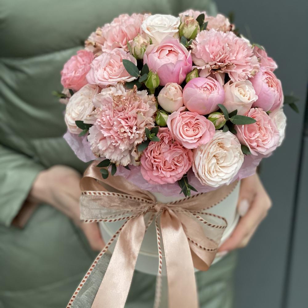 Композиция из кустовой розы, сортовой гвоздики и эвкалипта !
