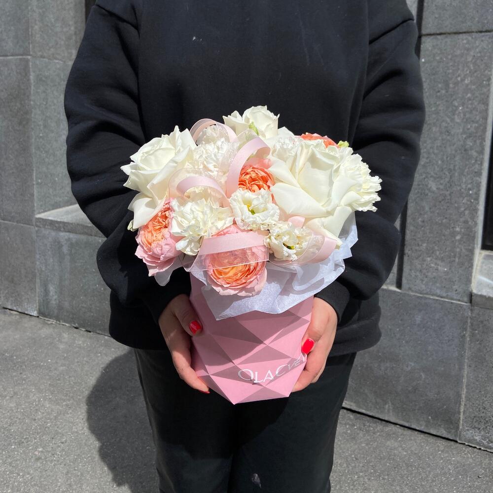 плая бланка – 3 шт.Лизиантус – 2 шт.Диантус – 3 шт.джульетта роза пионовидная – 1 шт.Коробка шляпная – 1 шт.Тишью – 2 шт.Лента атласная – 1 шт.пакет прозрачный для цветов – 1 шт.