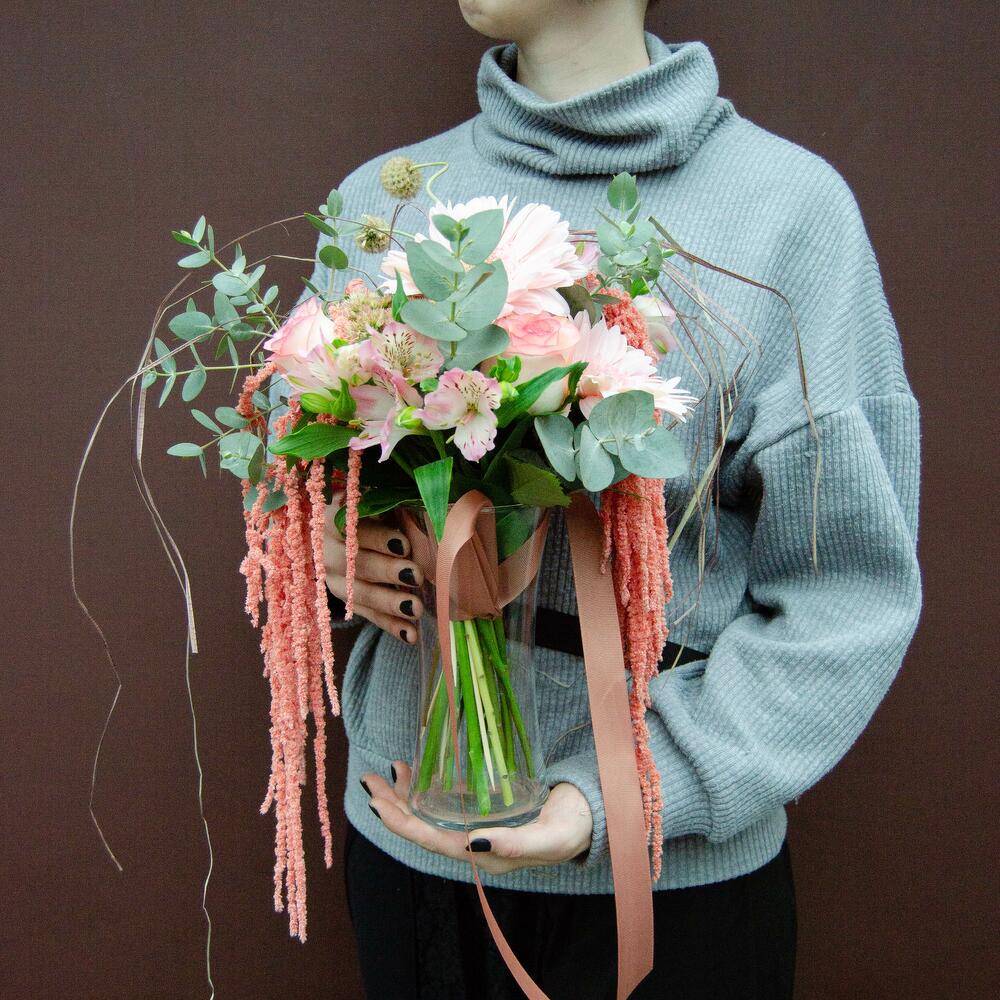 Альстромерия – 2 шт. Маттиола – 3 шт. Эвкалипт – 1 шт. Амарант – 1 шт. циперус папирус – 2 шт. Гербера – 1 шт. Ваза – 1 шт. Роза – 3 шт.