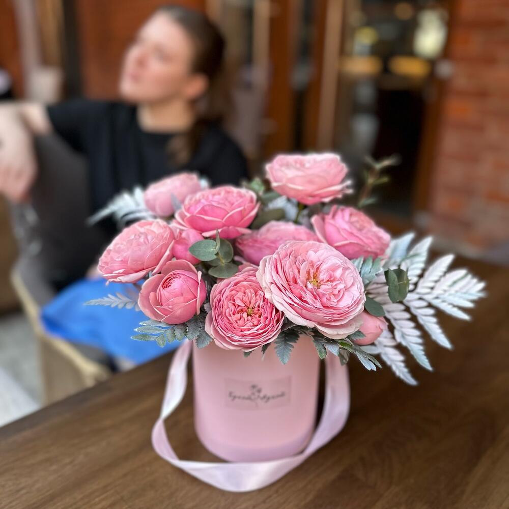 Эвкалипт – 1 шт.Коробка шляпная – 1 шт.Оазис флористический – 1 шт.Листья папоротника – 3 шт.роза кения пионовидная кустовая – 3 шт.