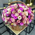 Роза – 29 шт. Хризантема – 33 шт. эустомы – 11 шт. зелень декоративная – 5 шт. Корзина плетеная – 1 шт.