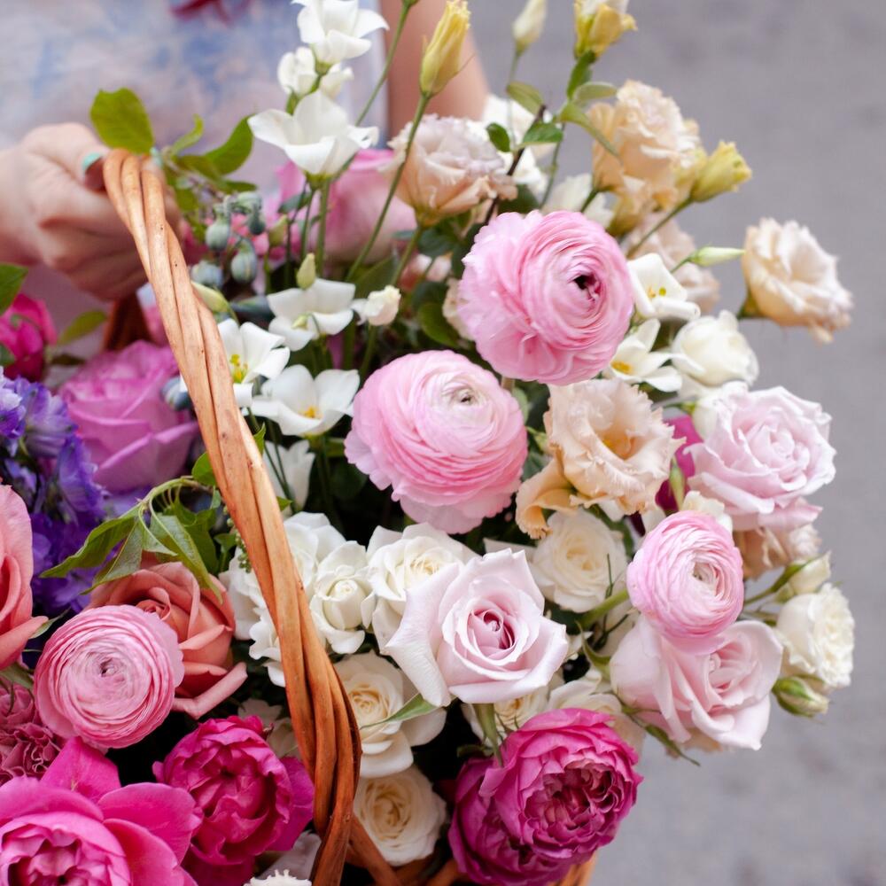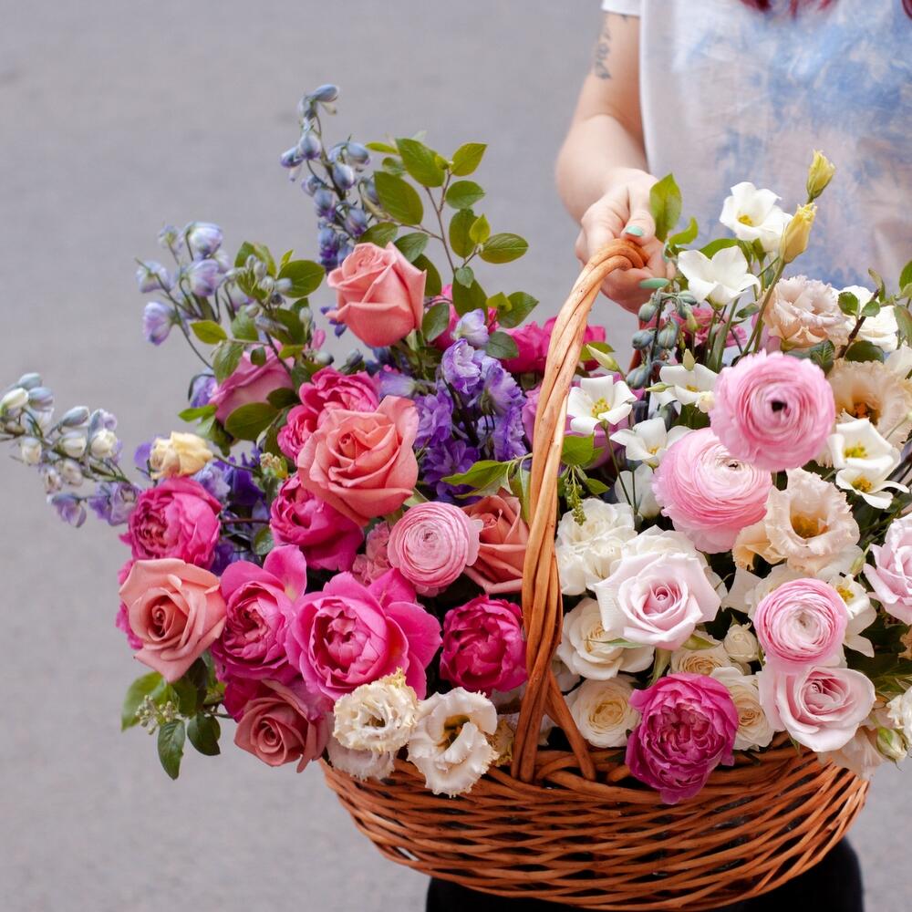 Дельфиниум – 4 шт.Ранункулюс розовый – 4 шт.Роза пионовидная кустовая – 5 шт.Лизиантус – 5 шт.Диантус – 4 шт.роза бариста – 5 шт.роза свит эскимо – 3 шт.козина плетеная – 1 шт.зелень декоративная – 5 шт.