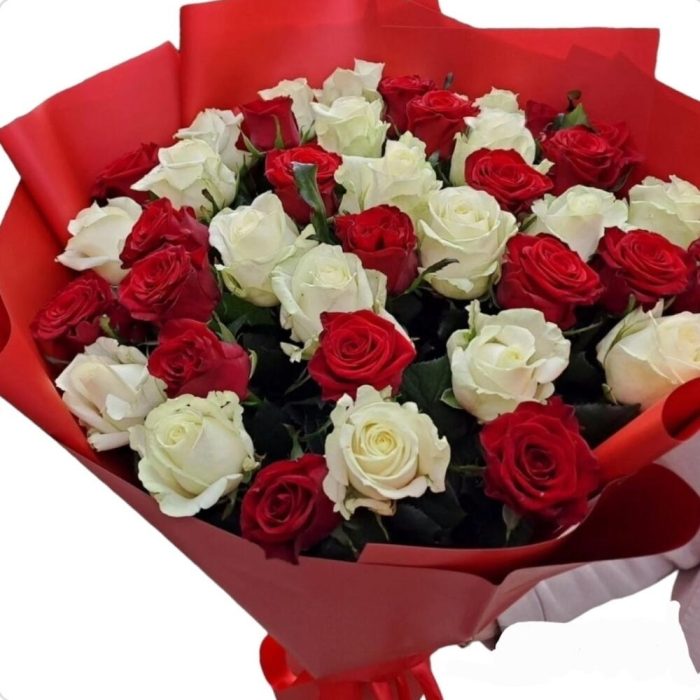 Роскошный букет из красных и белых роз в стильном оформлении будет по нраву каждой девушке. Если не знаете какой цвет роз нравится Вашей избраннице, то стоит выбрать данный букет с доставкой по Киеву или Киевской области.