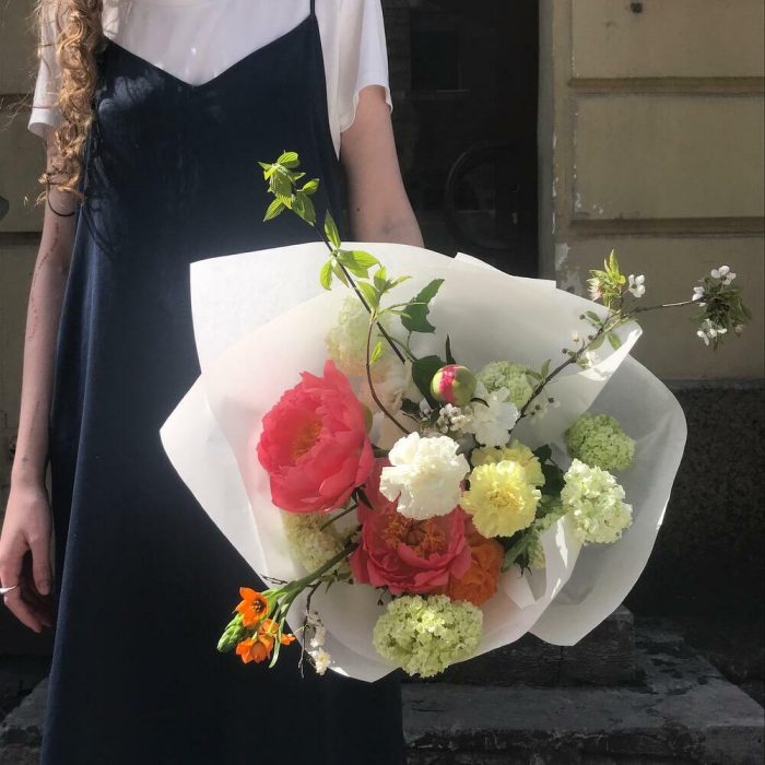 Вибурнум – 2 шт.Пион – 3 шт.Гвоздика – 6 шт.Орнитогалум – 1 шт.Роза садовая – 1 шт.яблоня – 2 шт.краснотал – 2 шт.