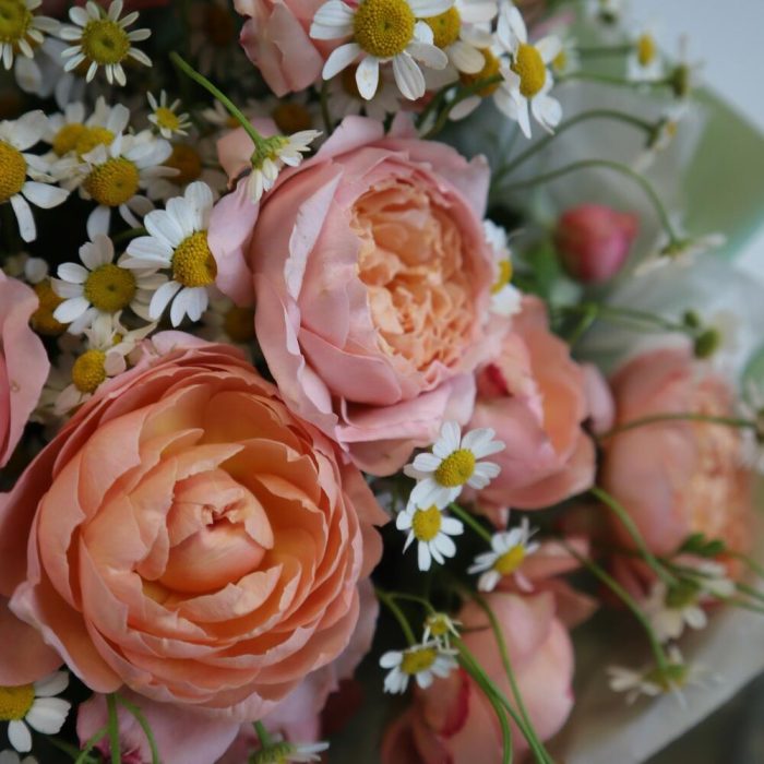 роза кустовая джульетта пионовидная – 3 шт.Матрикария (Ромашка Камила) – 5 шт.тишью водостойкое – 5 шт.пленка глянцевая – 4 шт.Рафия – 1 шт.