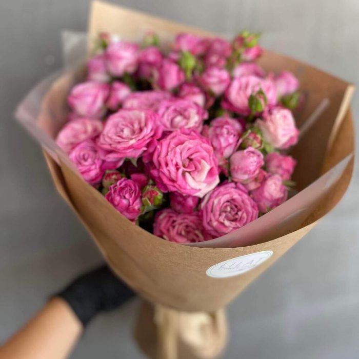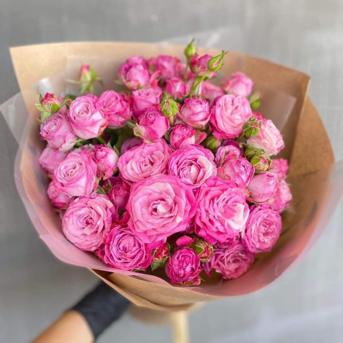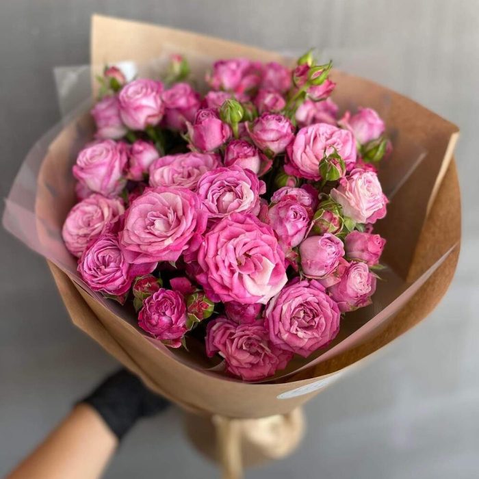 Упаковка дизайнерская – 2 шт. Открыточка с вашими пожеланиями – 1 шт. кустовые пионовидные розы – 9 шт.