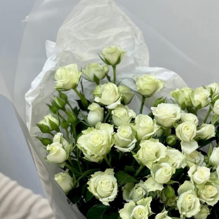 белые кустовые розы – 15 шт. Открыточка с вашими пожеланиями – 1 шт. Упаковка дизайнерская – 2 шт.