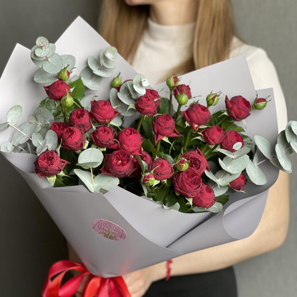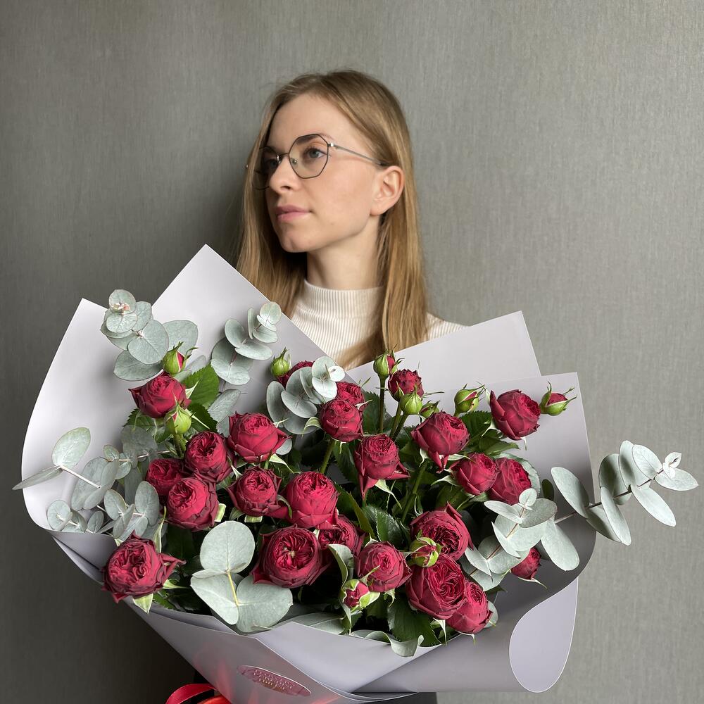 Букет из кустовой розовой пионовидной розы и эвкалипт