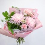 Маттиола – 2 шт.Лента атласная – 1 шт.Тишью – 1 шт.Диантус – 2 шт.Матрикария – 3 шт.Фисташка – 3 шт.Хризантема Антонов – 2 шт.Роза французская – 1 шт.Аквапак – 1 шт.Корейская пленка – 3 шт.ветки декоративные – 2 шт.