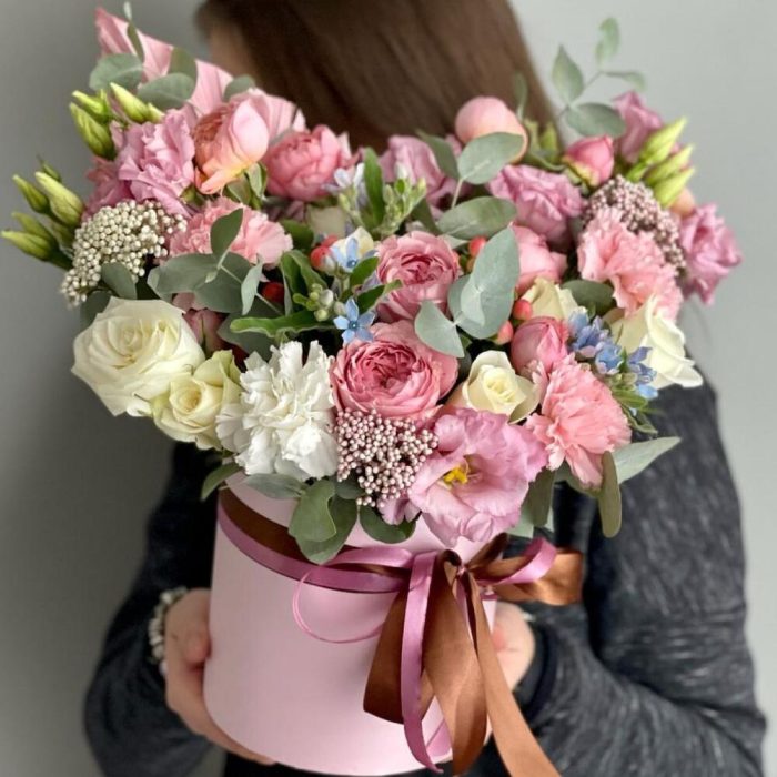 Диантус – 5 шт.Кенийская роза – 7 шт.Оксипеталум – 3 шт.Эвкалипт – 1 шт.Гиперикум – 2 шт.джульетта роза пионовидная – 3 шт.Оазис флористический – 2 шт.Коробка шляпная – 1 шт.Лизиантус – 2 шт.Лист пальмы – 1 шт.Озотамнус – 3 шт.