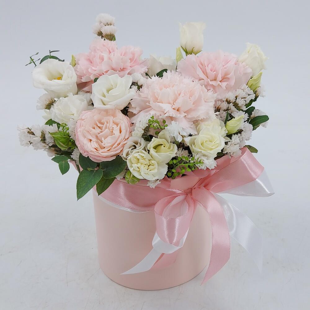 Роза кустовая – 1 шт.Статица – 1 шт.Эвкалипт – 1 шт.Эустома – 1 шт.Лента атласная – 2 шт.Пленка матовая – 1 шт.Флористическая губка (оазис) – 1 шт.гвоздика сортовая (диантус) – 3 шт.