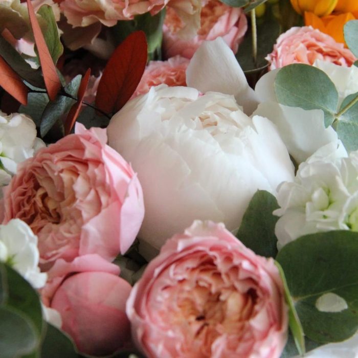 Роза кустовая пионовидная – 2 шт.Орнитогалум – 2 шт.Гвоздика – 7 шт.Маттиола – 3 шт.Эвкалипт стабилизированный – 3 шт.Эвкалипт – 9 шт.Ранункулюс – 2 шт.Упаковка – 1 шт.
