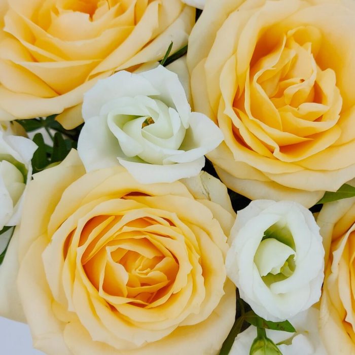Персиковые розы с эустомой в коробке Пич