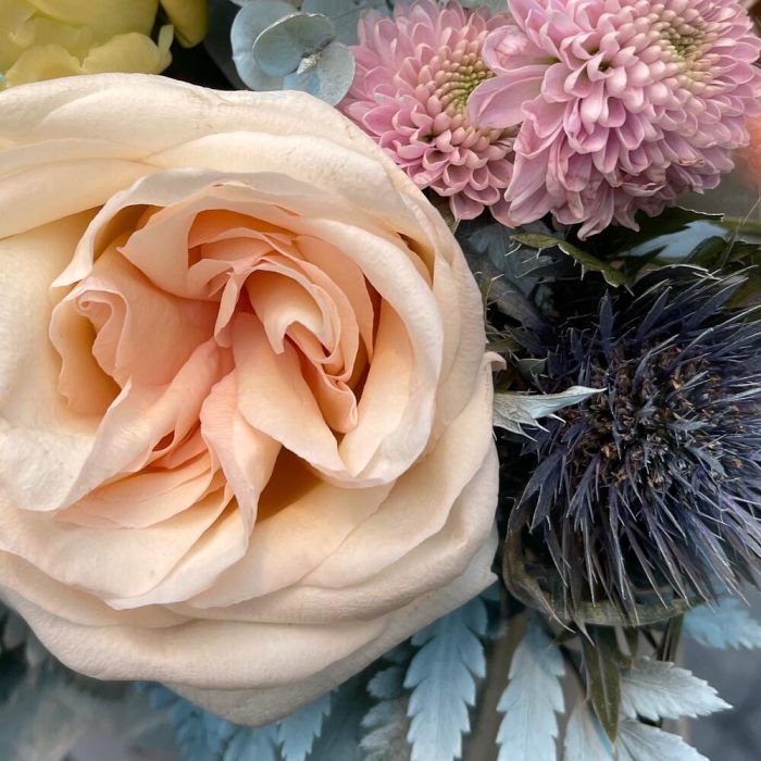 роза вайт о хара( ароматная) – 1 шт.Гвоздика – 3 шт.Маттиола – 1 шт.Эрингиум – 1 шт.Сантини – 2 шт.Папоротник – 1 шт.