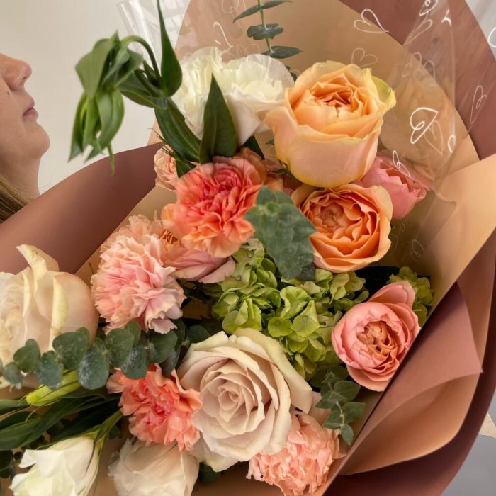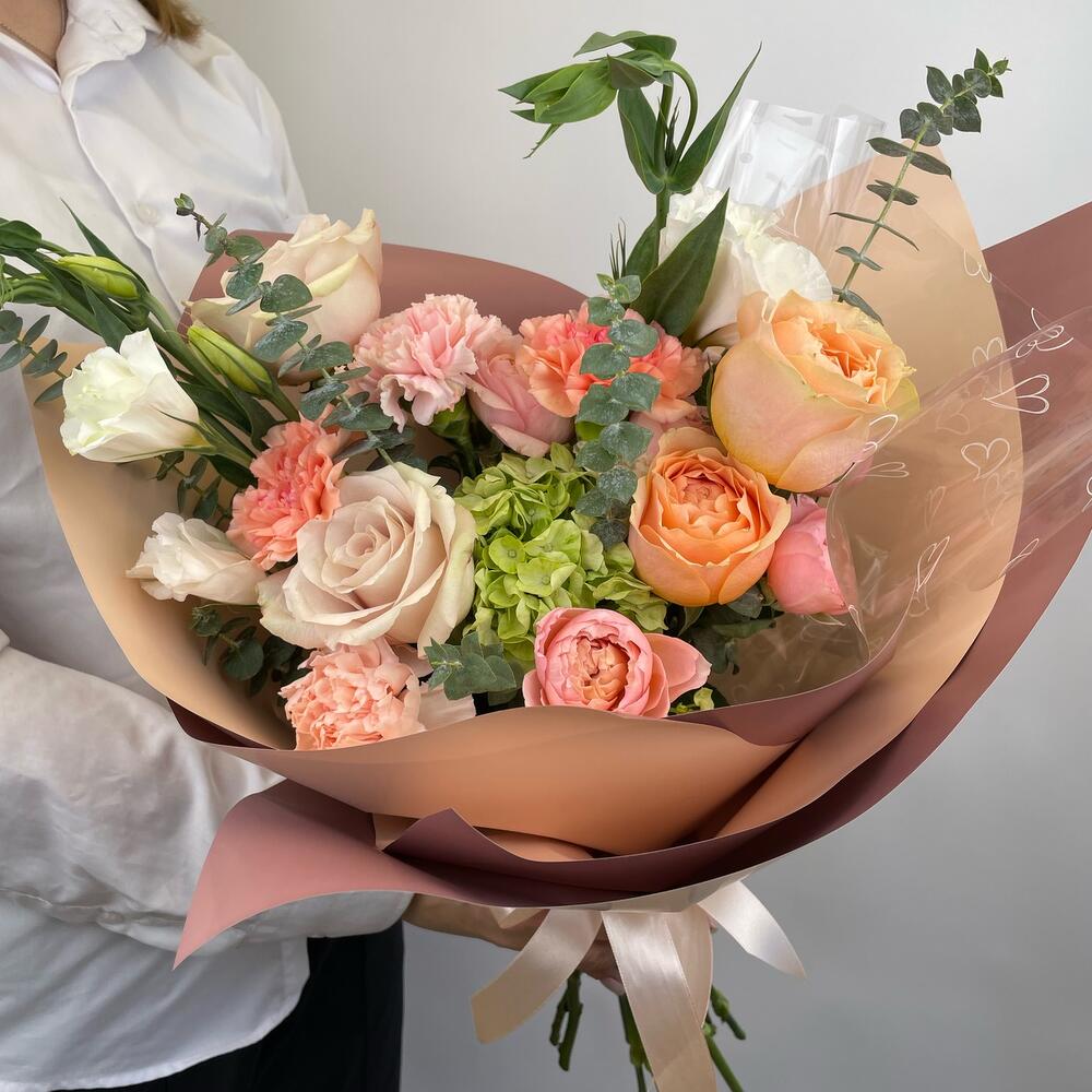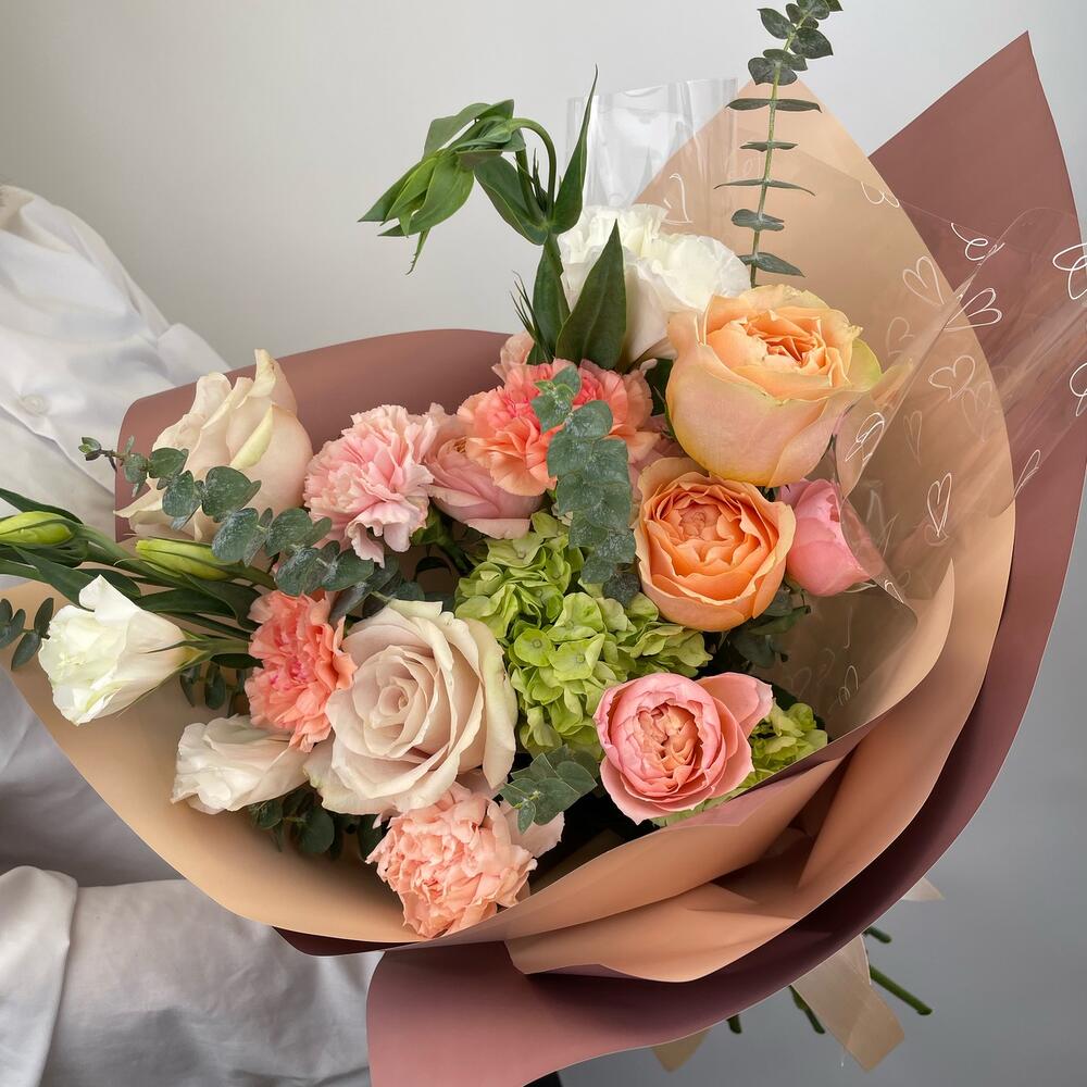Гортензия – 1 шт.Диантус – 5 шт.Роза пионовидная – 4 шт.Упаковка дизайнерская – 3 шт.эустома белая – 2 шт.Эвкалипт Baby Blue – 6 шт.Кустовая роза пионовидная – 2 шт.
