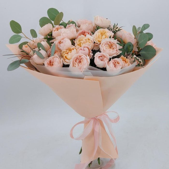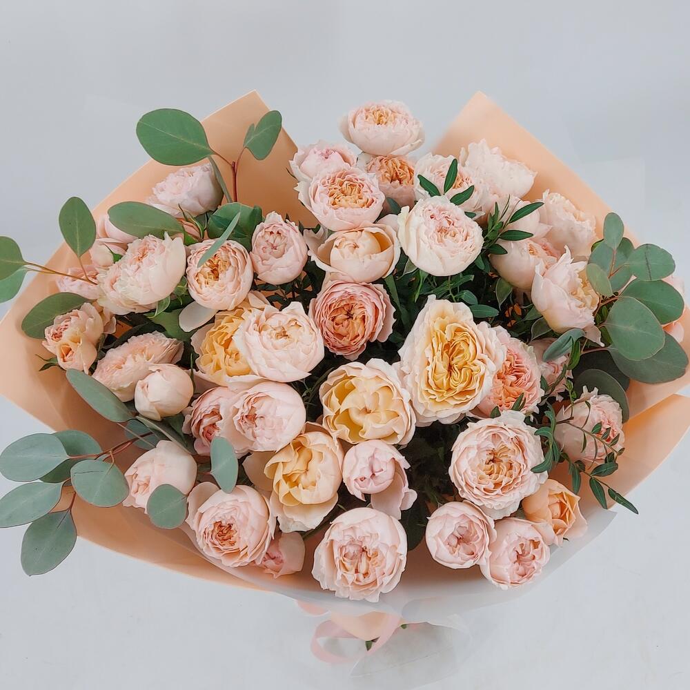Роскошные пионовидные розочки Джульетта с веточками эвкалипта. Такой букет всегда уместен и подойдёт для любого повода: День Рождения, именины, годовщина свадьбы, рождение ребенка, 8 марта, День Святого Валентина, выпускной и т.д. Можно вручить маме, сестре, подруге, коллеге, учителю, любимой.