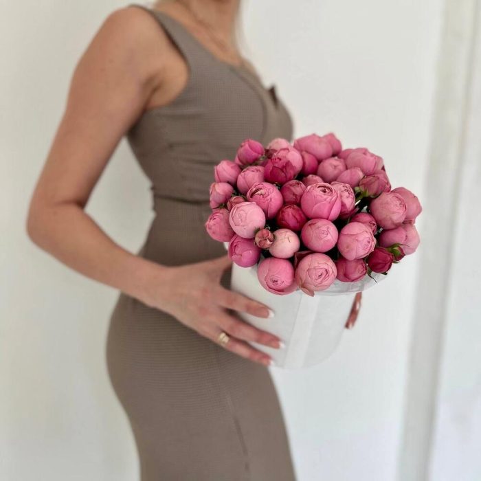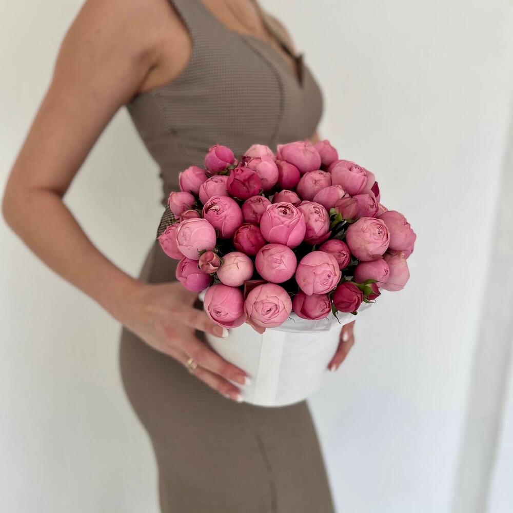 Пиафлор (оазис) – 2 шт.Шляпная коробка – 1 шт.Пионовидная кустовая роза – 5 шт.