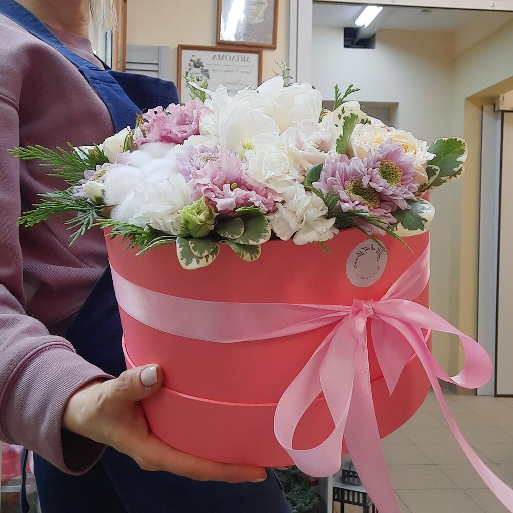 Питтоспорум – 3 шт.Роза кустовая – 1 шт.Хризантема кустовая – 1 шт.Коробка шляпная – 1 шт.Роза пионовидная – 1 шт.Диантус кустовой – 2 шт.Пирожные макарон – 5 шт.Конифер – 1 шт.Хлопок натуральный – 3 шт.Эустома алиса – 2 шт.Губка флористическая – 1 шт.пион белый импортный – 1 шт.