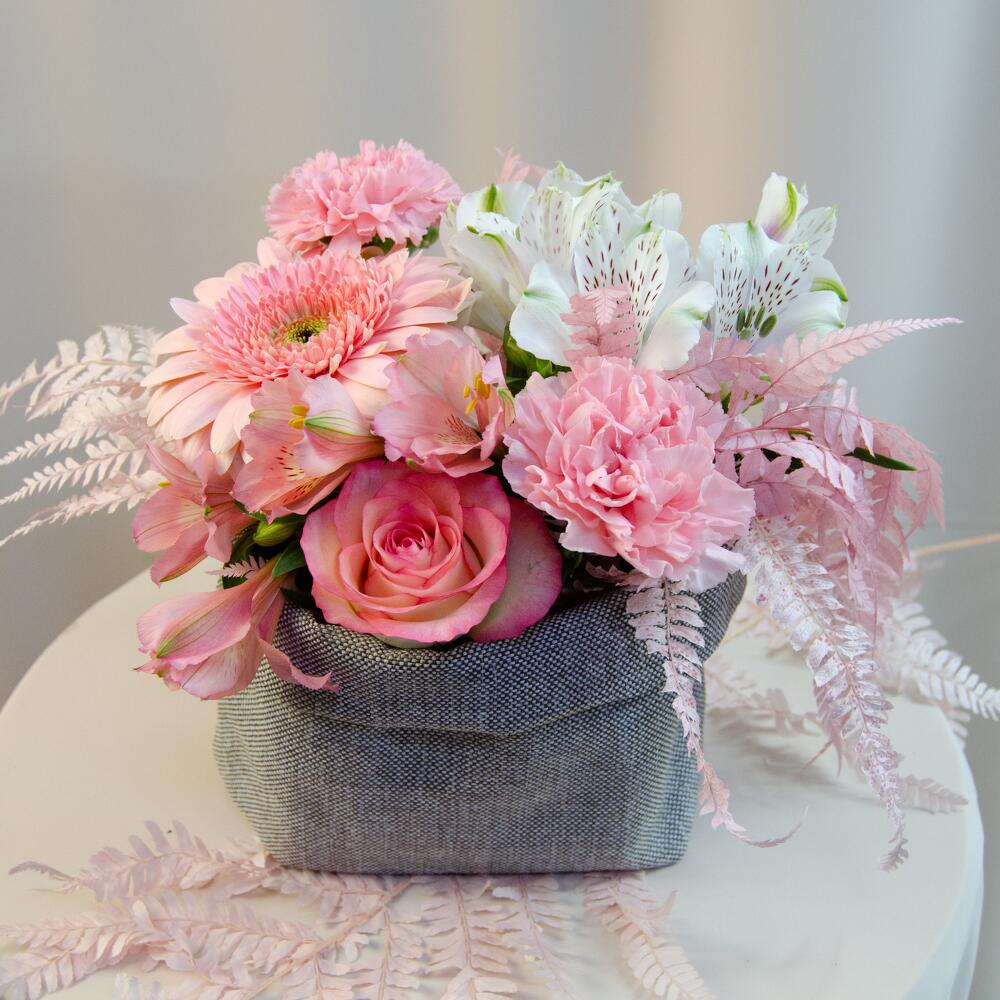 Альстромерия – 2 шт. Гвоздика – 2 шт. Гербера – 1 шт. Оазис – 1 шт. Фисташка – 2 шт. Мешочек – 1 шт. папоротник стабилизированный – 1 шт. Роза – 1 шт.