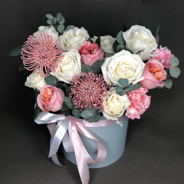 Роза пионовидная – 11 шт.Эвкалипт – 4 шт.Диантус – 3 шт.леукоспермум розовый – 2 шт.Оазис флористический – 2 шт.Коробка – 1 шт.Лента атласная – 3 шт.