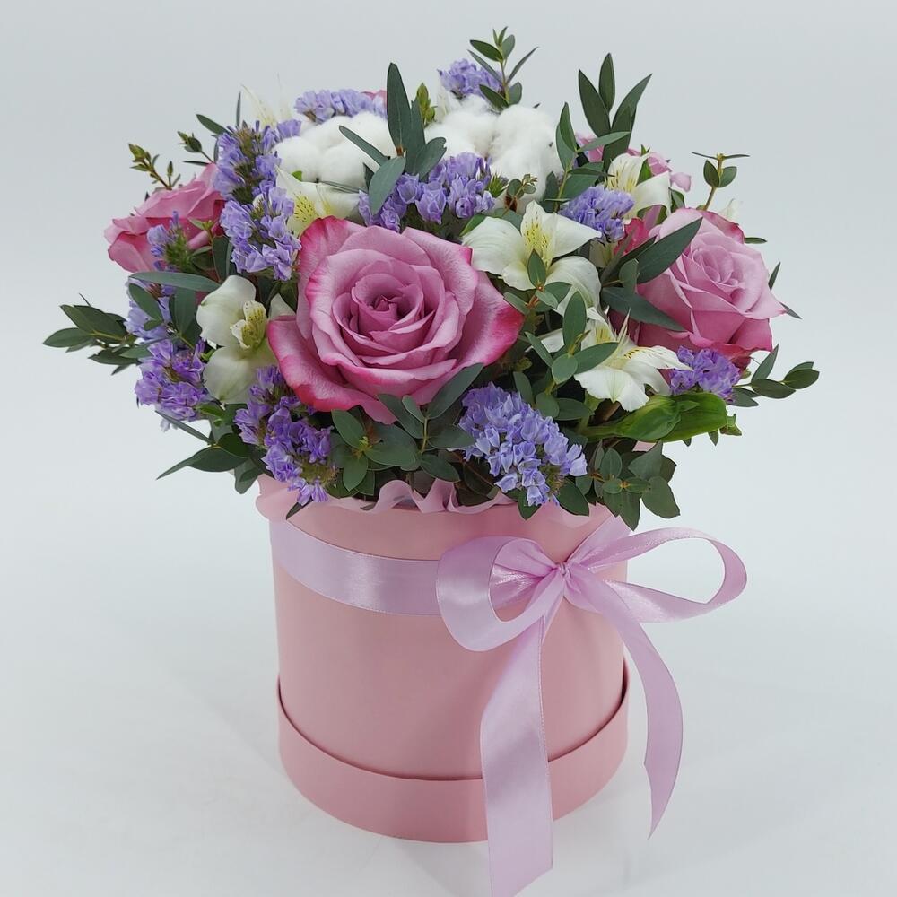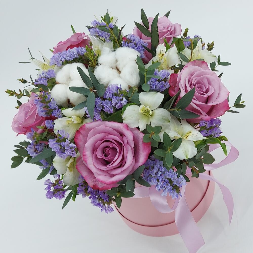 Розы, альстромерия и хлопок в коробке "Сиреневые облака"