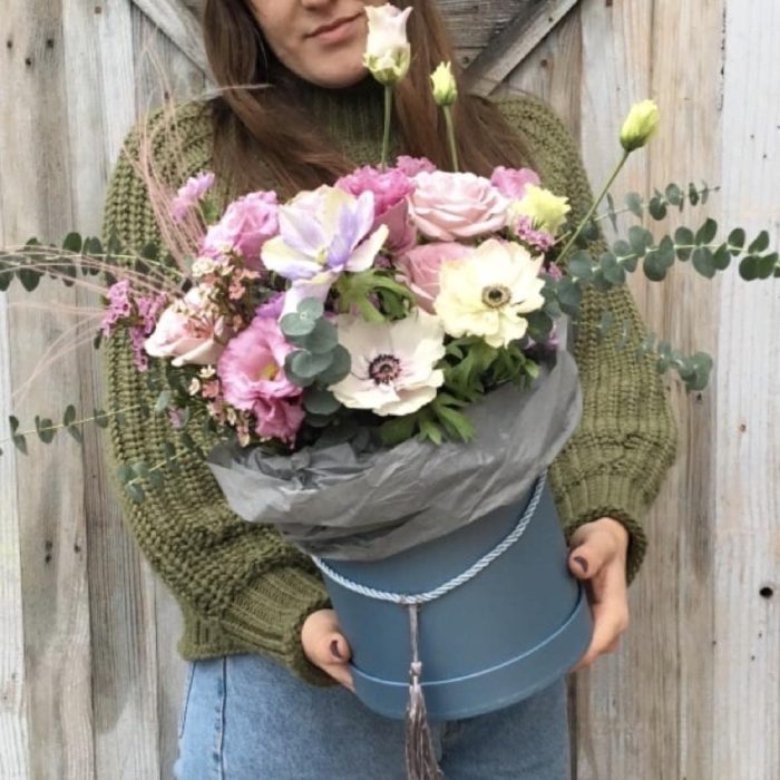 Маттиола – 3 шт.Роза – 7 шт.Лизиантус – 3 шт.Ваксфлауэр – 3 шт.Эвкалипт – 5 шт.Ковыль – 2 шт.Шляпная коробка – 1 шт.Тишью – 2 шт.Оазис – 1 шт.Анемон – 3 шт.