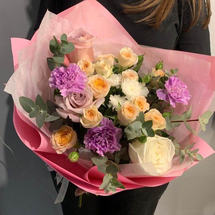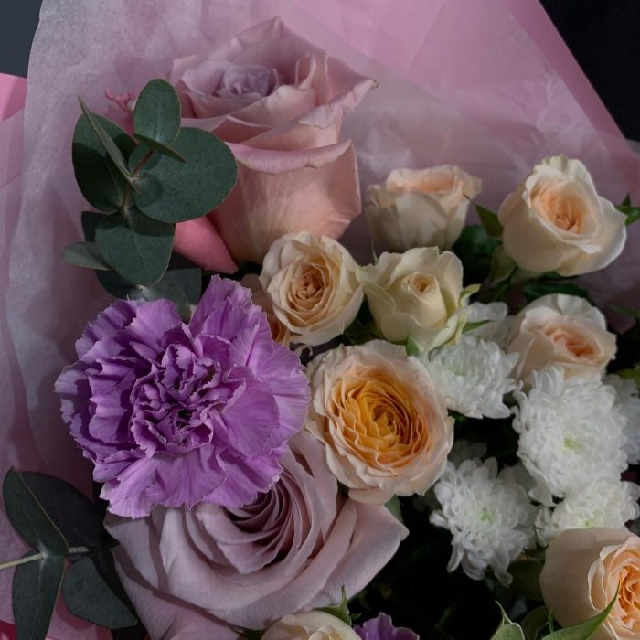 Альстромерии, Гвоздики, Кустовые розы, Лизиантусы, Розы, Хризантемы