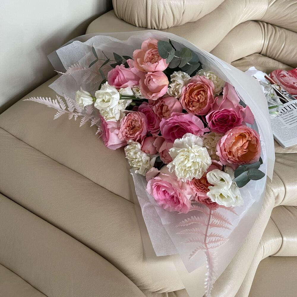Роза Эквадор – 6 шт.Роза Джульетта – 3 шт.Диантус – 5 шт.Эустома – 3 шт.Эвкалипт – 5 шт.Фисташка – 5 шт.ветки декоративные – 3 шт.Упаковка дизайнерская – 2 шт.Лента атласная – 1 шт.наклейка фирменная – 1 шт.