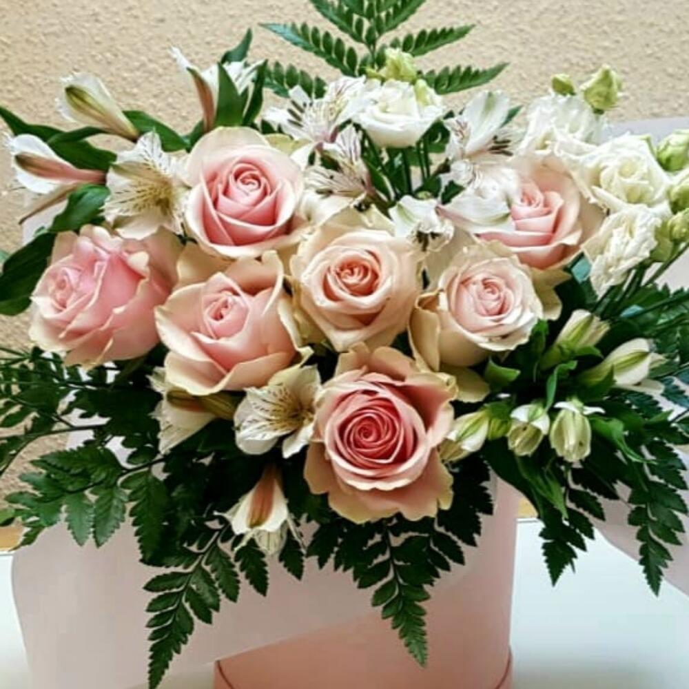 Роза Эквадор – 7 шт.Альстромерия – 4 шт.Листья папоротника – 3 шт.Коробка шляпная – 1 шт.бумага дизайнерская – 1 шт.