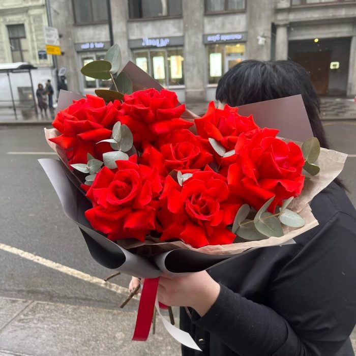 Эвкалипт – 3 шт.Лента атласная – 2 шт.Упаковка корейская пленка – 1 шт.французские розы – 7 шт.