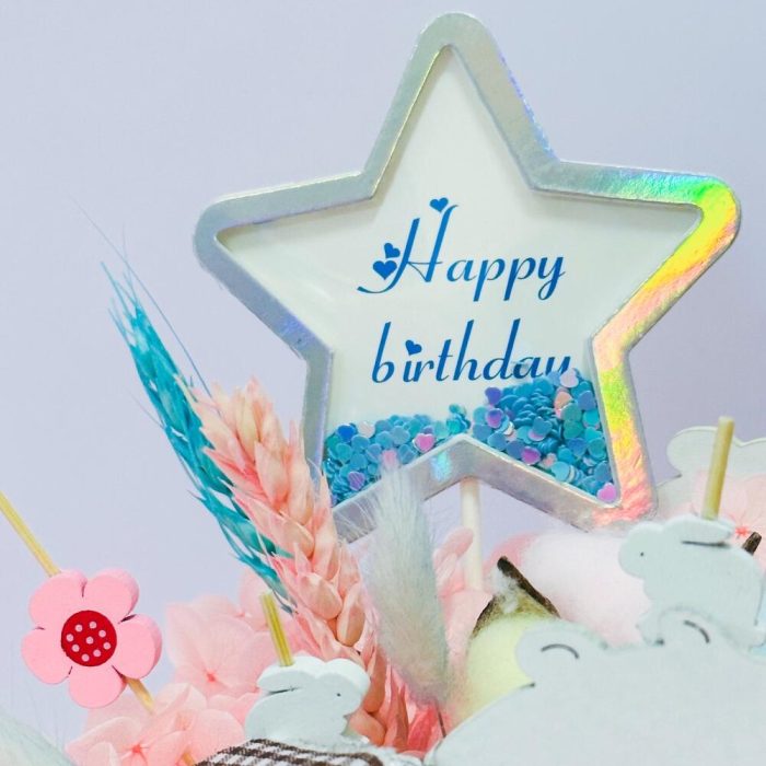 гортензия стабилизированная персиковая – 1 шт.пшеница (сухоцвет) разноцветный – 2 шт.хлопок (сухоцвет) радужный – 1 шт.лагурус (сухоцвет) разноцветный – 5 шт.декор на палочке – 6 шт.кашпо деревянное фигурное мишки – 1 шт.декор с блестками – 1 шт.Упаковка дизайнерская – 1 шт.