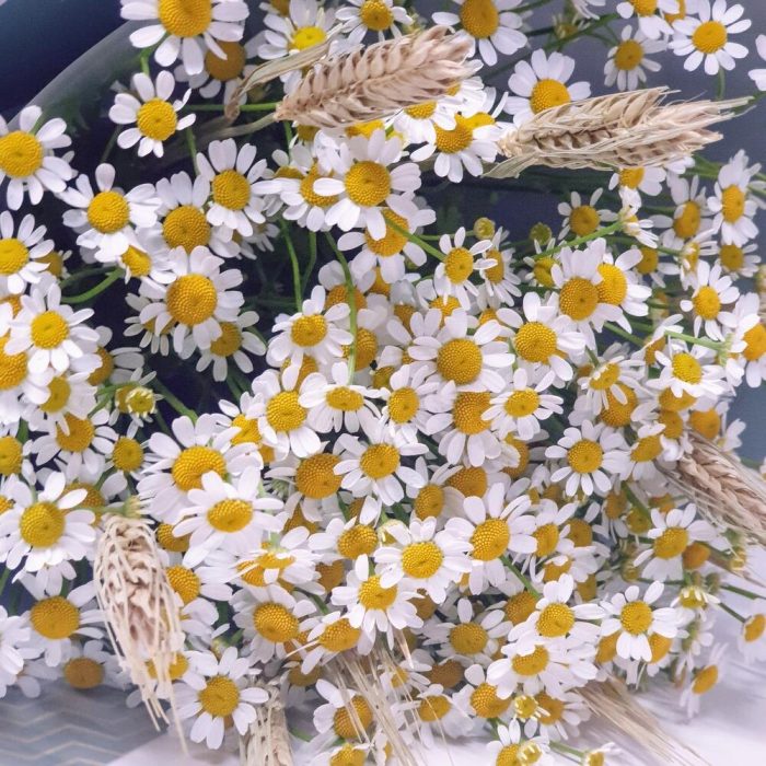 Лента атласная – 1 шт.Ромашка кустовая – 7 шт.Крафт упаковка – 1 шт.Открыточка с вашими пожеланиями – 1 шт.пленка матовая прозрачная – 1 шт.любовь флориста(бесплатно) – 1 шт.колоски пшеницы сухоцвет – 10 шт.