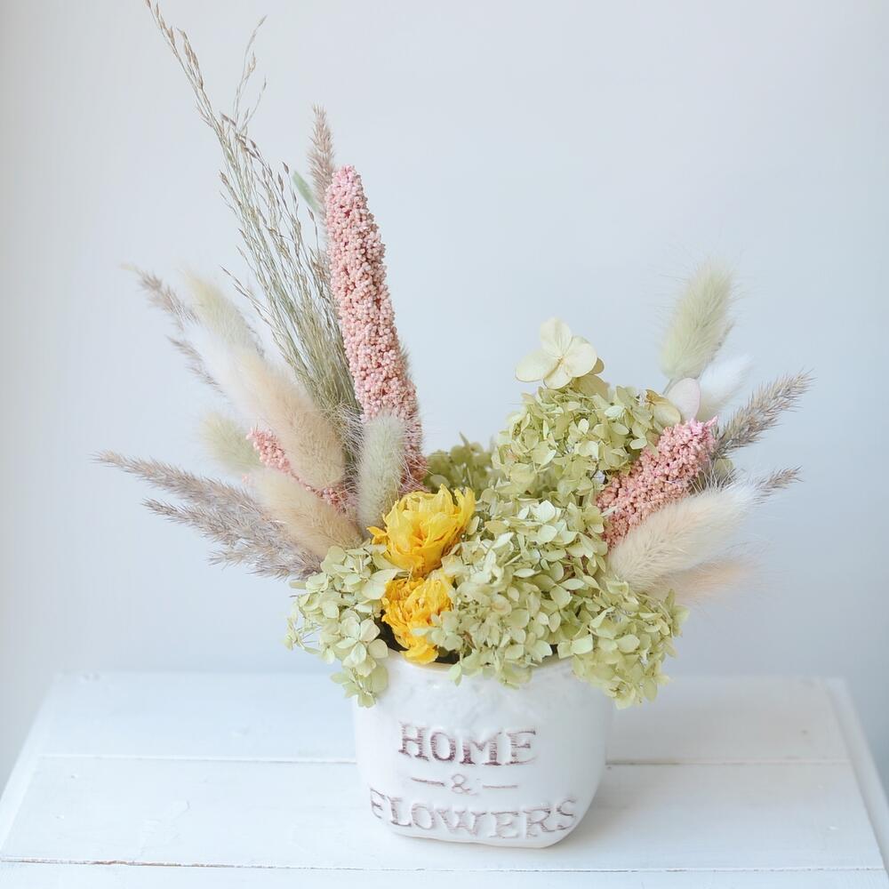 Сетария – 3 шт.Кашпо керамическое – 1 шт.Оазис для сухоцветов – 1 шт.гортензия сухоцвет – 1 шт.камыш декоративный пучок – 1 шт.нарцисс сухоцвет – 2 шт.лагурус микс пучок – 1 шт.